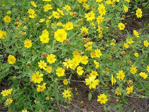 金雞菊,金雞菊屬一年生或二年生草本植物,高可達60厘米,葉片羽狀分裂,裂片圓卵形至長圓形,頭狀花序單生枝端,外層總苞片與內層近等長,舌狀花黃色,基部紫褐色,狀黑紫色。瘦果倒卵形,7-9月開花。